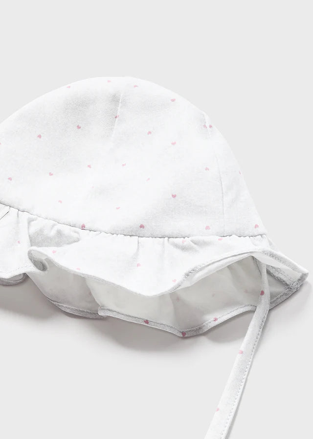 Gorro para recién nacido confeccionado con tejidos suaves y ligeros que refrescará en los días más calurosos de primavera y verano. Elementos decorativos: volante decorativo.