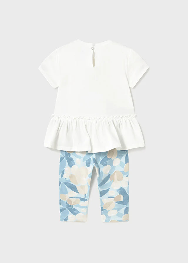 Vestido estilo pichi en denim elástico suave con dos bolsillos delanteros con apliques. Top de manga larga a juego con estampado integral y puños, cuello y bajo acanalados.