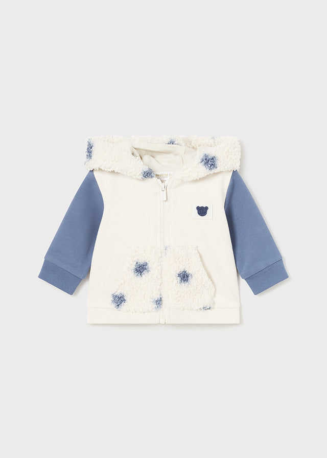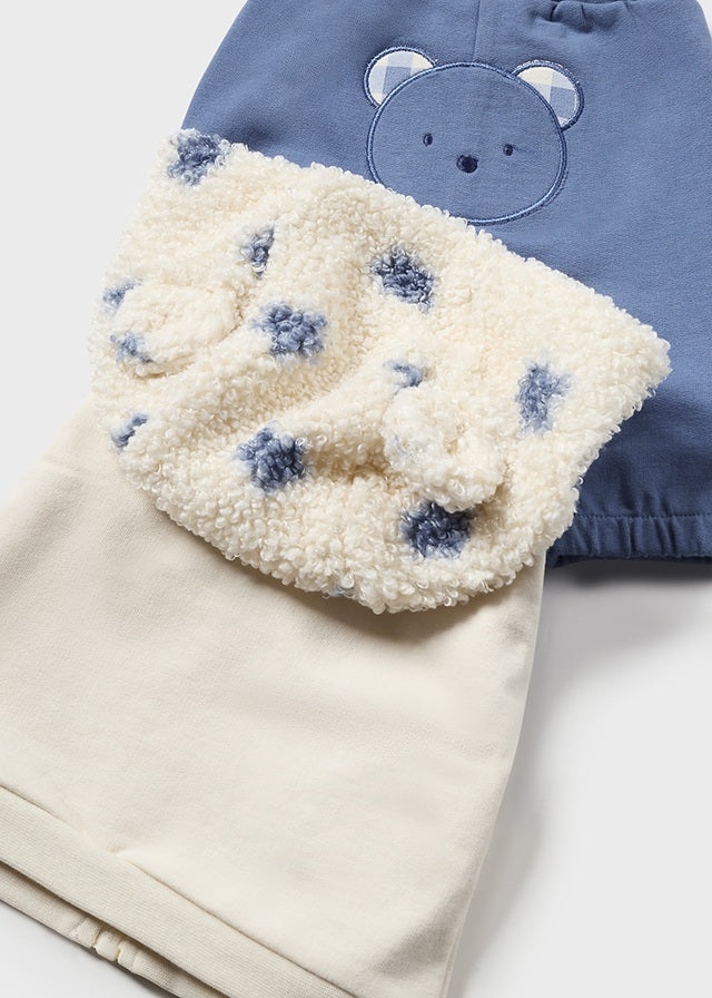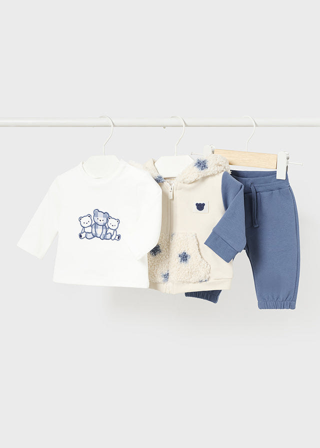 Conjunto de chándal para bebé niño de la colección otoño-invierno Mayoral Newborn. Incluye tres piezas combinadas: una sudadera con capucha, una camiseta de manga larga y un pantalón largo a juego.