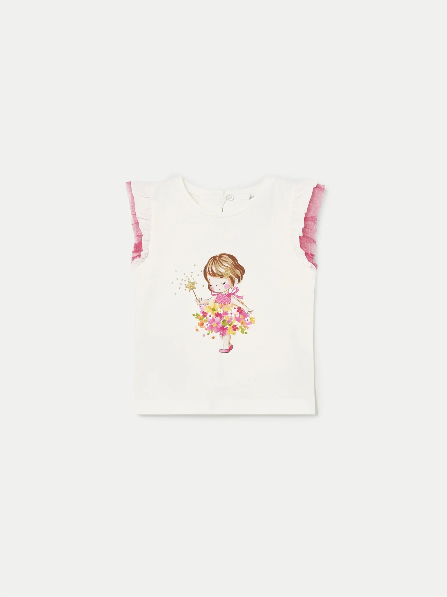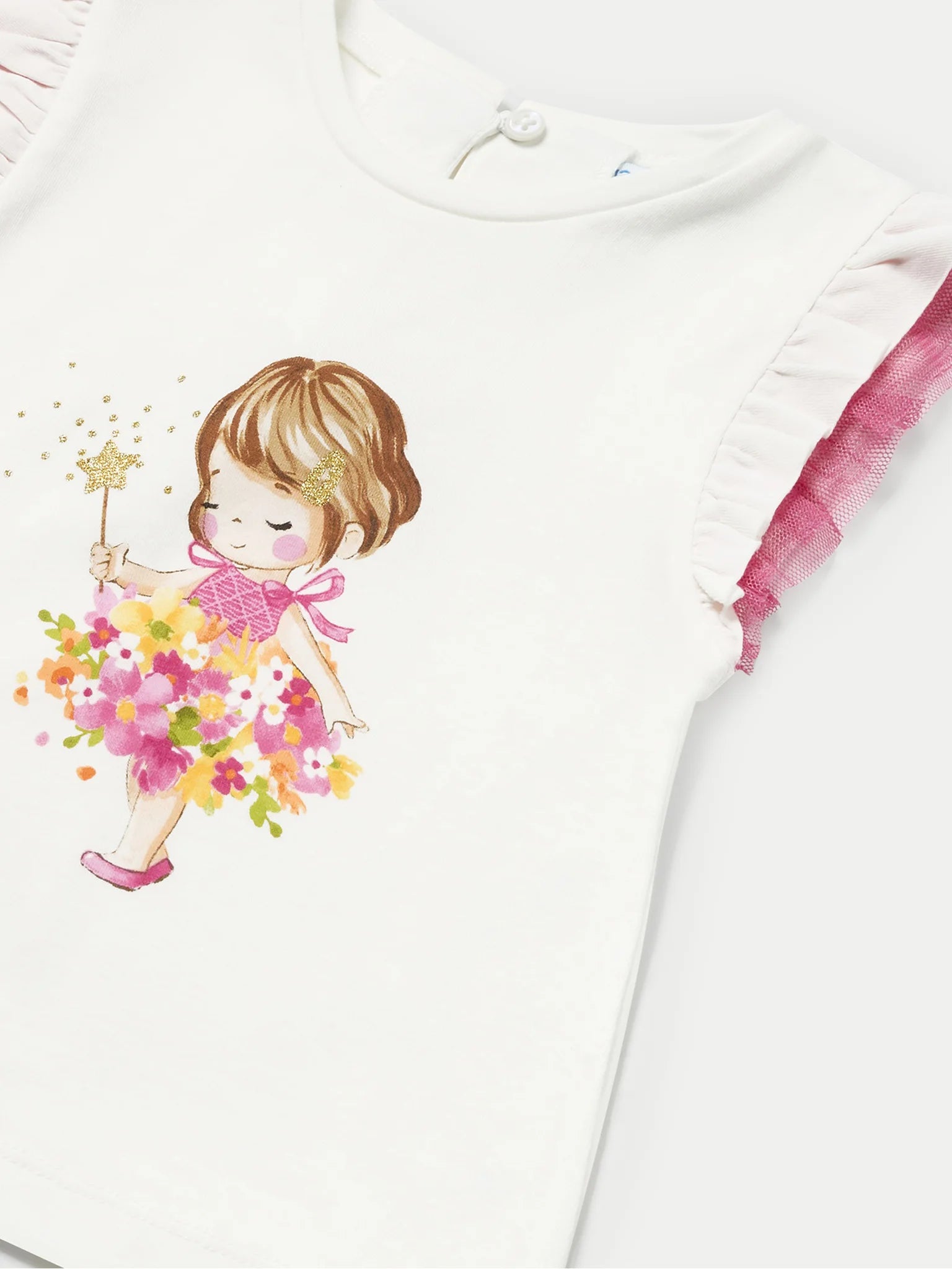 Cada día puede ser una celebración del estilo con este conjunto para niña de Mayoral, compuesto por una falda de tul rosa con volantes y una camiseta sin mangas con estampado femenino.