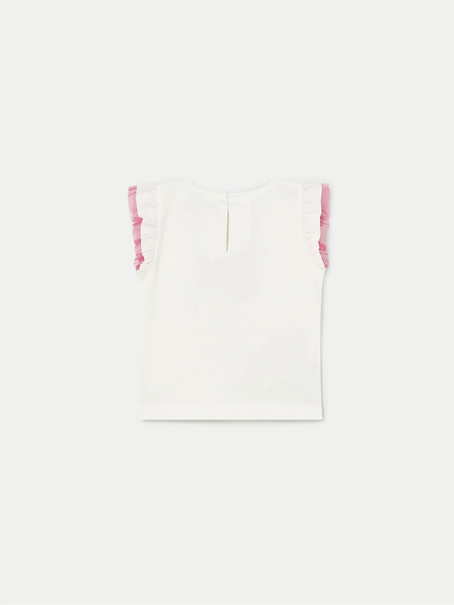 La camiseta, elaborada en 87% algodón, 8% elastano y 5% poliéster, destaca por su diseño fresco, sin mangas, en tonos blanco y rosa, con un dulce estampado central que aporta un toque tierno y femenino.