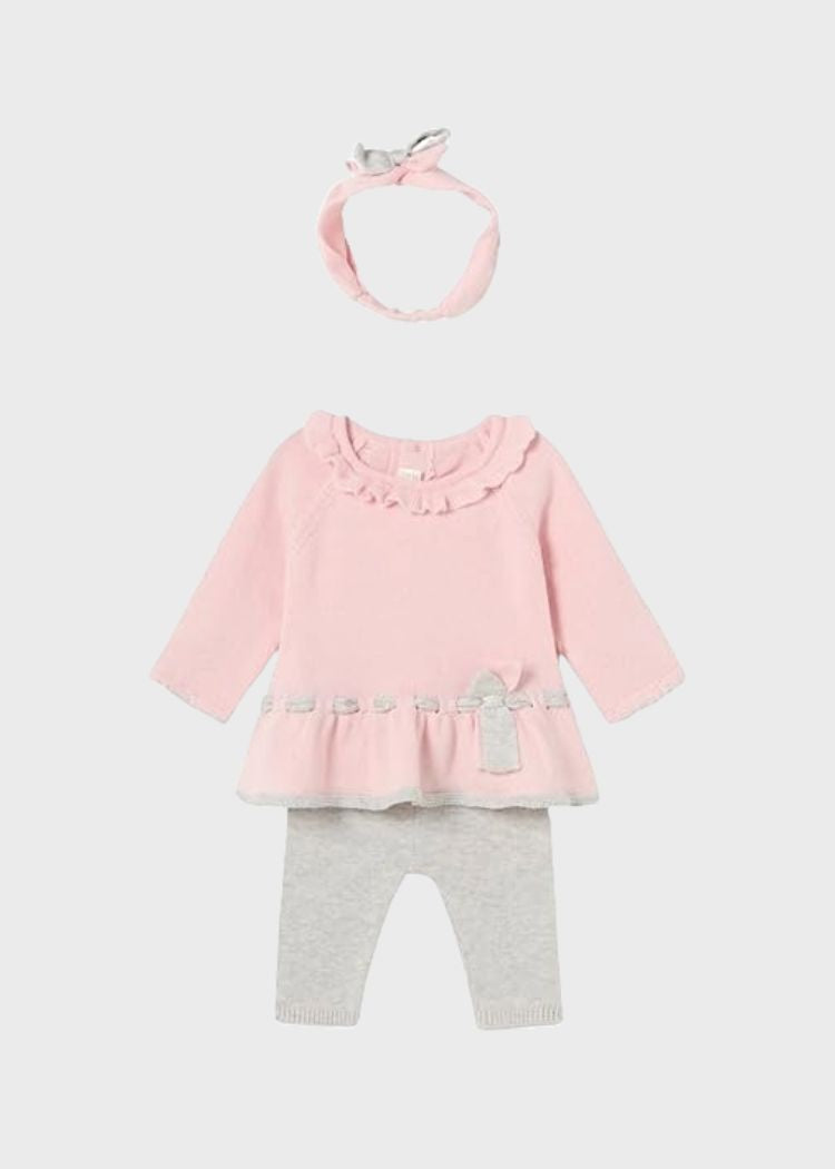 Encantador conjunto de tres piezas para bebé niña de Mayoral, confeccionado en suave punto para ofrecer el máximo confort y calidez desde los primeros días.