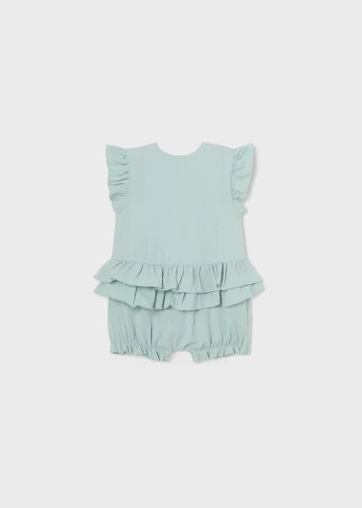 Pijama sin mangas para recién nacido. Cuello redondo. Cierre con un único botón a presión. Botones a presión en la entrepierna para facilitar la puesta de la prenda. Elementos de adorno: volantes decorativos.