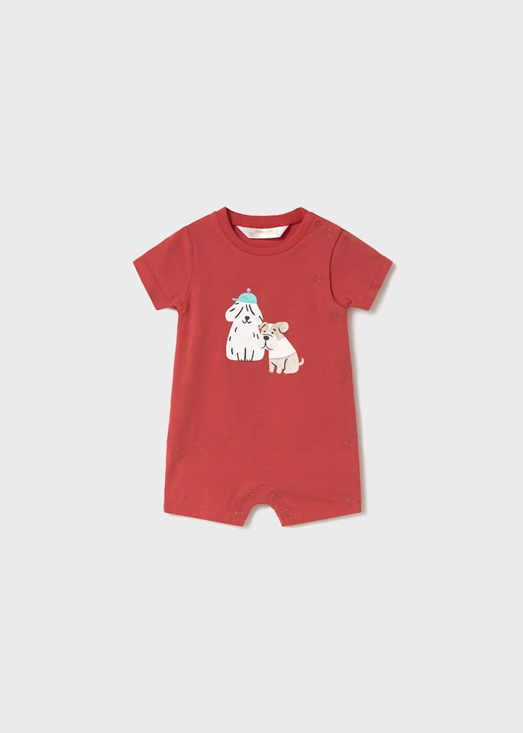Pijama de manga corta para recién nacido. Cuello cruzado y abertura lateral completa que cierra con botones a presión. Botones a presión en la entrepierna para facilitar la puesta de la prenda. Elementos de adorno: serigrafía (print).
