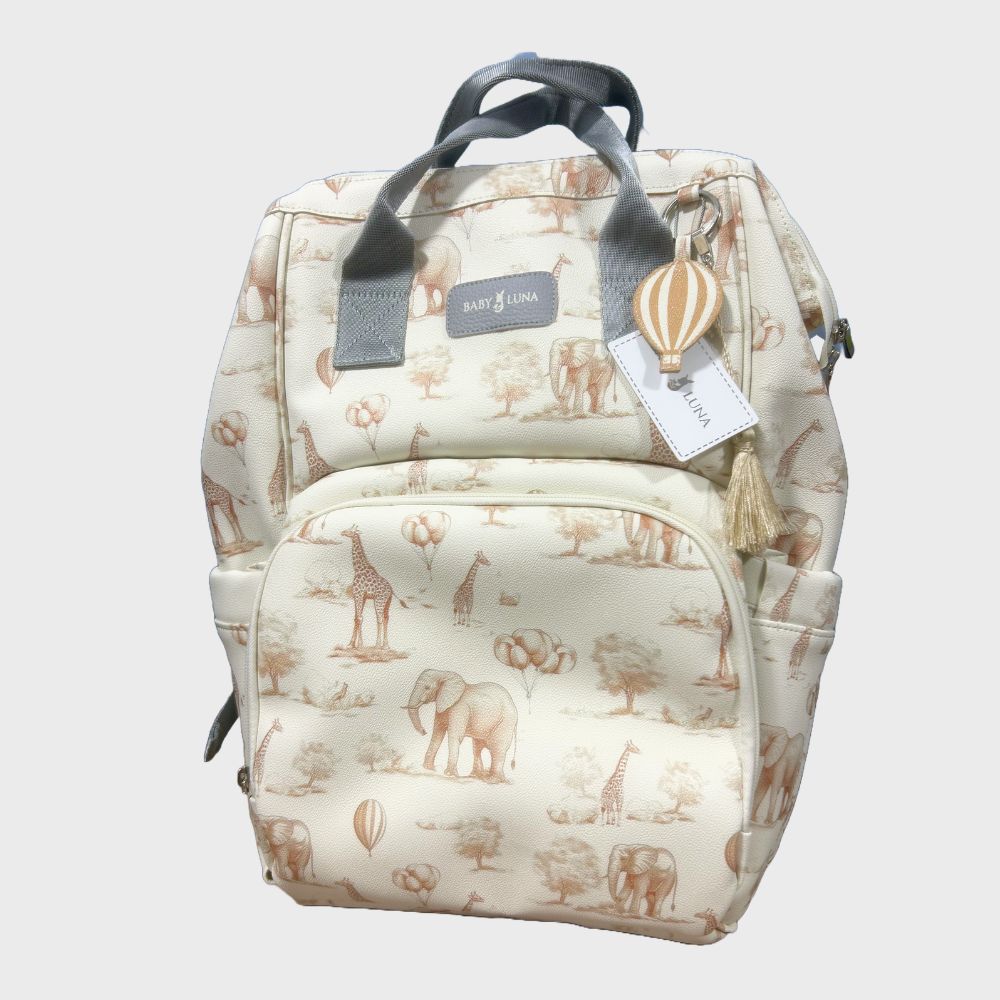 Pañalera Jirafas y Elefantes En Cuero Baby Luna Tipo Morral