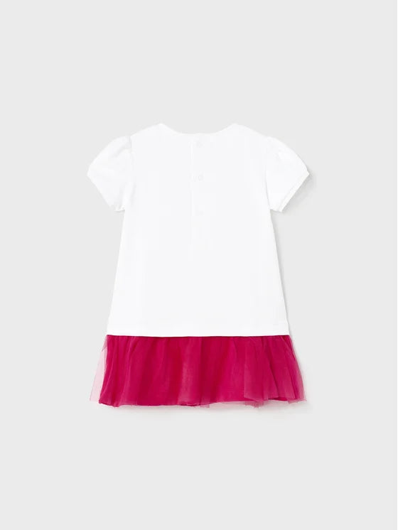 ¡Consigue un vestido estampado para niña de Mayoral de la colección Primavera-Verano 2023! Un modelo delicado con mangas cortas, escote redondo y volantes de tul en el bajo. Se abrocha en la espalda. Confeccionado en un material cómodo y de alta calidad con estampado.