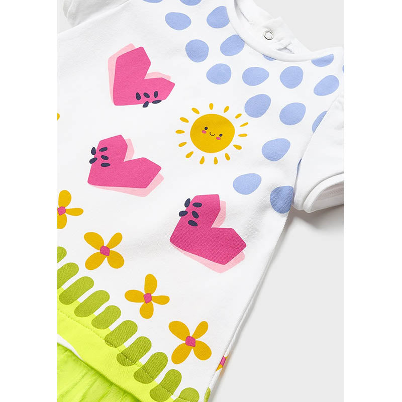 ¡Consigue un vestido estampado para niña de Mayoral de la colección Primavera-Verano 2023! Un modelo delicado con mangas cortas, escote redondo y volantes de tul en el bajo. Se abrocha en la espalda. Confeccionado en un material cómodo y de alta calidad con estampado.
